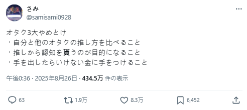 近期在日本 X 社群上,一則關於「推活御宅族的三大禁忌」的貼文引起廣大迴響,不少御宅網友非常認同,希望所有從事推活、宅活們的夥伴千萬不要踩雷,讓自己跟他人都受苦,成為熱議話題。