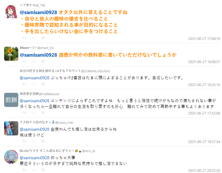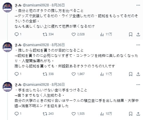 「不只宅圈,這三點對所有人都適用。」、「這根本該寫進課本。」、「有時候自己也會忍不住想爭取偶像認知,看了覺得要好好自省。」、「太沉迷應援反而失去生活重心,適時抽離休息一下也很重要。」、「不用砸大錢也能應援,雖然我自己還是會花(笑)。」