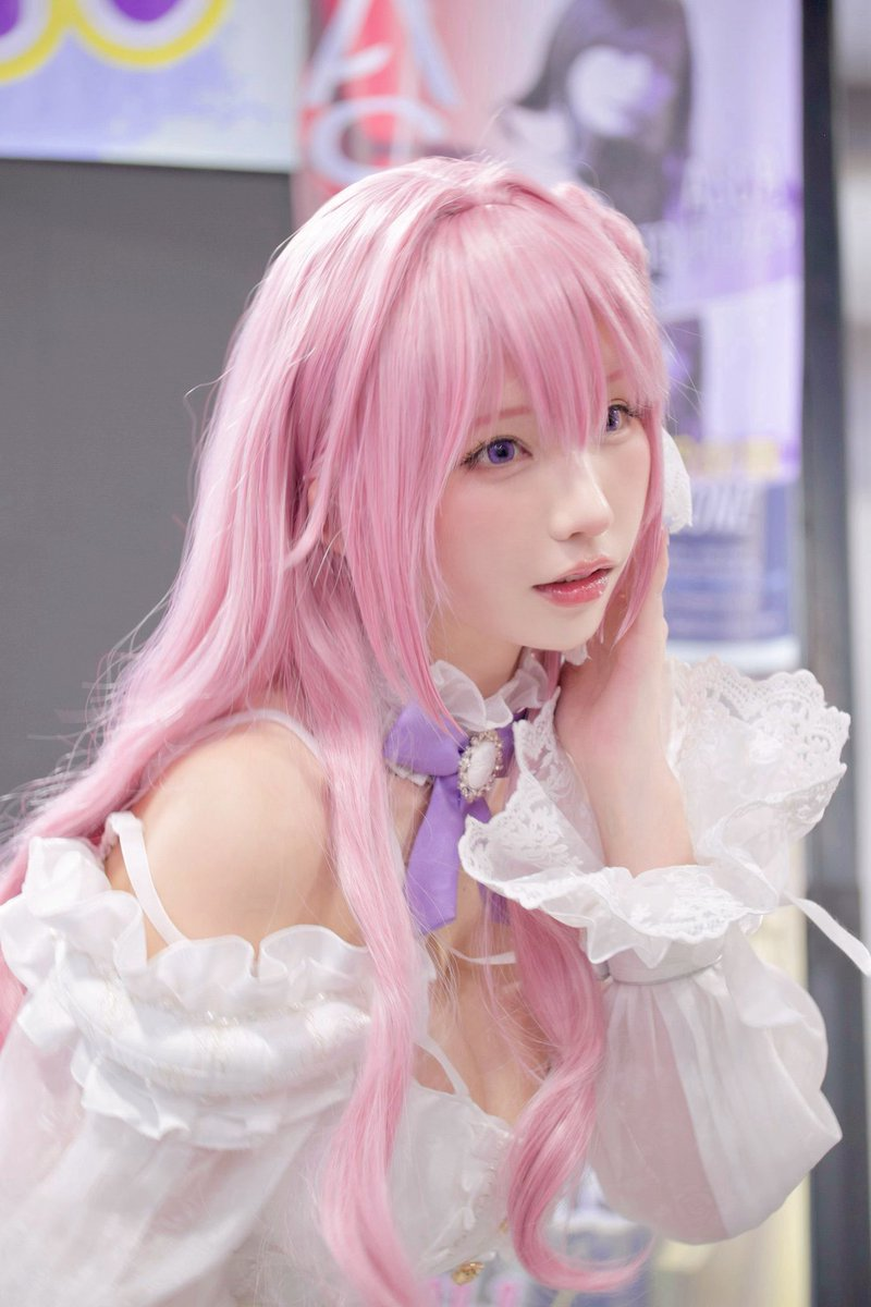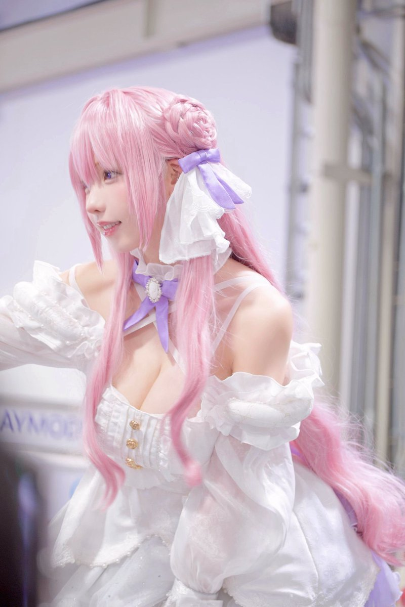 えなこ這次是為了參加台灣的「 開拓動漫祭」 特別準備的 Cosplay。她換上了桃樂絲招牌的白色荷葉邊洋裝,再搭配粉紅色的長髮,整體造型宛如從遊戲裡走出來,夢幻又可愛。