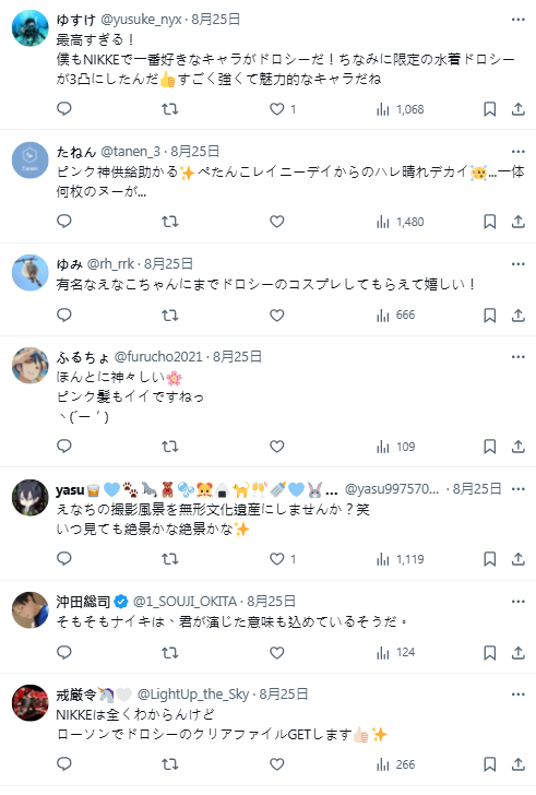 除了許多台灣網友對她相隔六年來到台灣感到開心外,不少日本網友也稱羨能看到えなこ出角的桃樂絲,紛紛稱讚 : 「天使下凡了吧!」、「美翻天了,根本真人版二次元」、「能看到自己喜歡的角色被喜歡的 Coser 出角,太幸福了。」