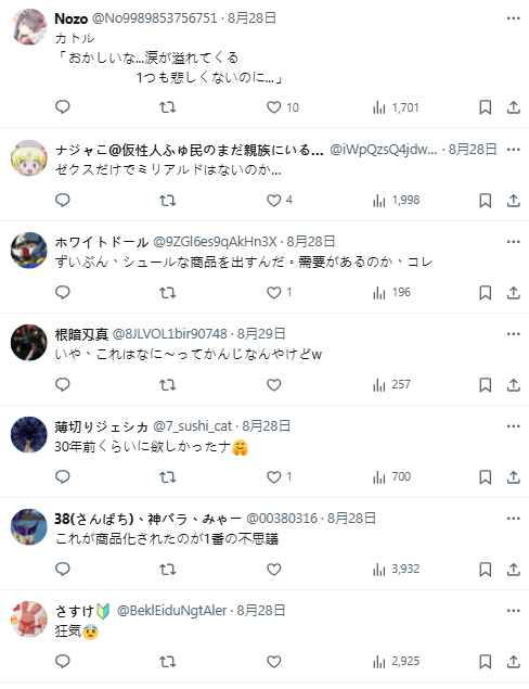 不少網友看到這商品推出也大為驚訝,想著「沒想到《新機動戰記鋼彈W》也有推出這種商品的一天阿...」,過去較多是女性向作品或遊戲才會推出這類周邊,沒想到三十年過去,W 還是如此有能耐阿 XD。