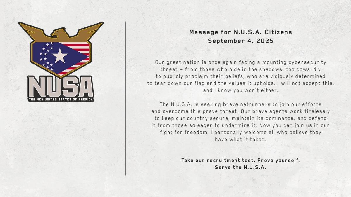 同時,官方社群近日發布一封來自 NUSA 總統羅薩琳·邁爾斯(Rosalind Myers)的「公開信」,強調國家正面臨網路安全威脅,並號召「勇敢的駭客」加入防衛行列。