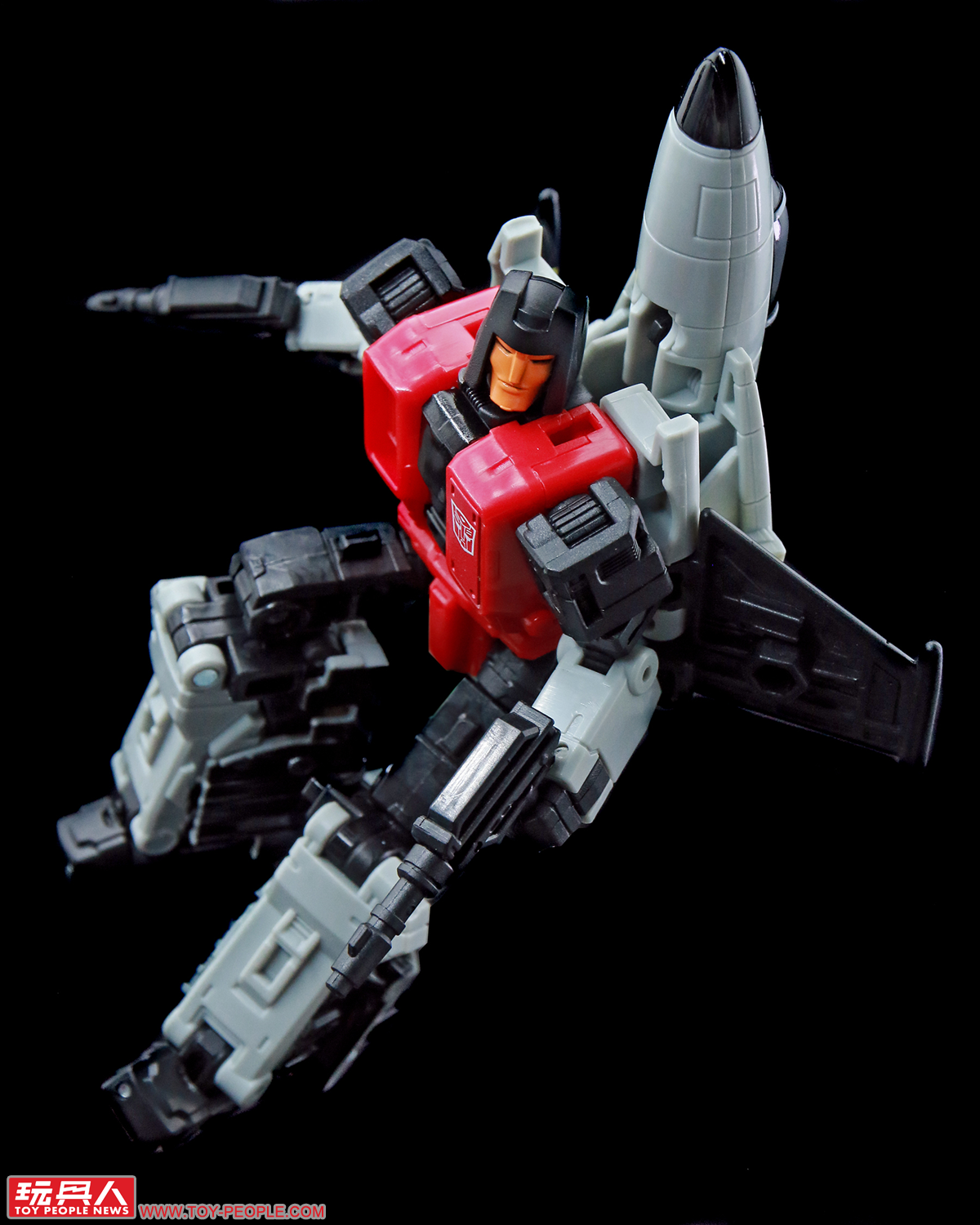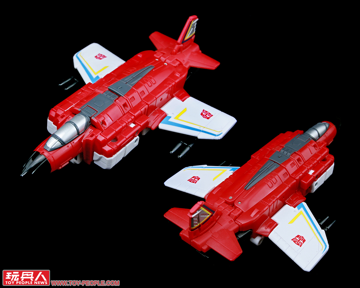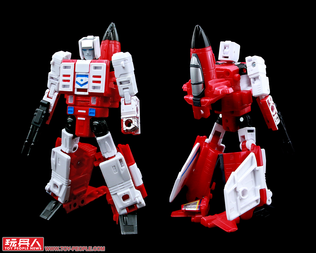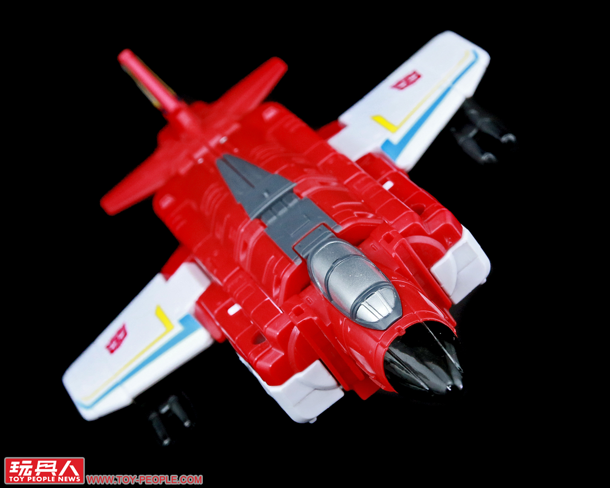 ▼載具模式,變形為擬似F-4的戰機造型,並還原了G1經典的紅白配色。
