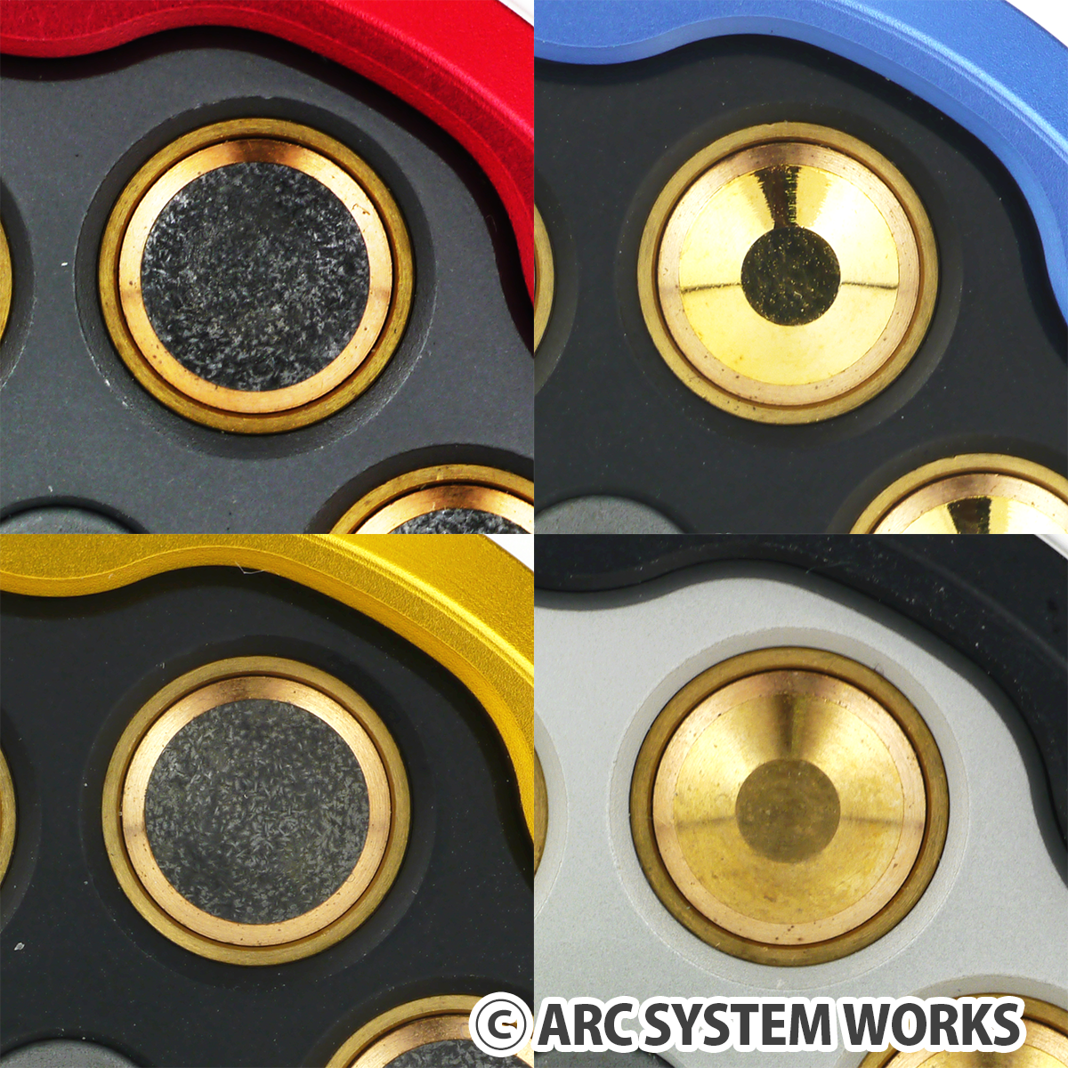 這次全新再販,推出除了原本的紅色外還有另外四種新顏色,設計上也都略有不同,但保持一貫的高質感跟可玩性。溜溜球上有原設定的六顆彈丸,用了黃銅、銅、鐵三種金屬嵌入來表現不同顏色,透過車床切削精準打造。