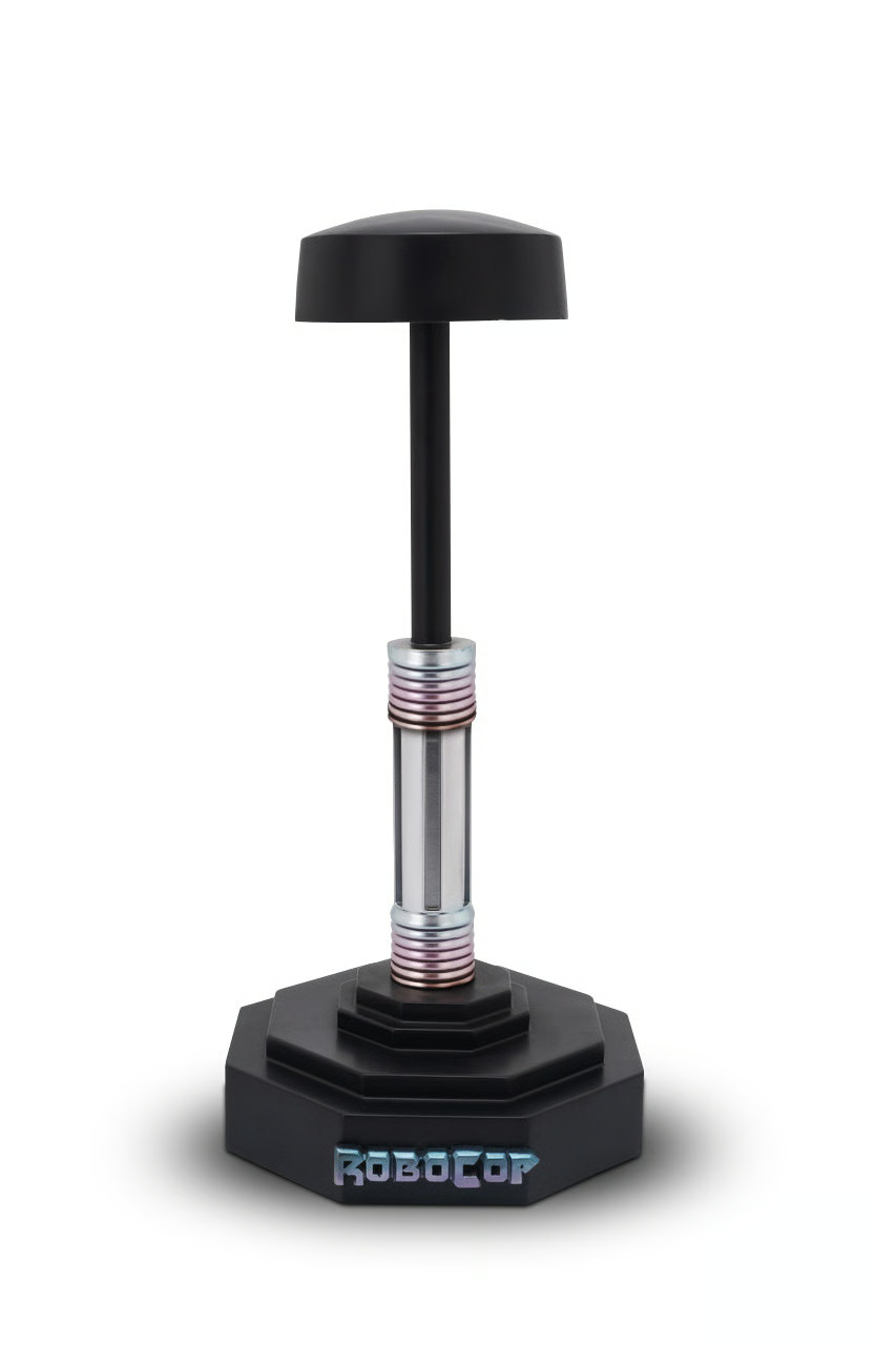 本次以驚人 1/1 比例還原的機器戰警頭盔採用玻璃纖維強化塑膠(fiberglass)為材料,並輔以多層的金屬色塗裝工藝,力求還原螢幕中機器戰警頭盔與裝甲所散發出的銀色與藍紫色,圓弧光滑的表面真的相當漂亮,側邊的 OCP POLICE·001 字樣也考究還原,搭配展示底座擺設時高約 43 公分,整體散發出一股冰冷的未來科技感與強悍魄力,超帥啊!