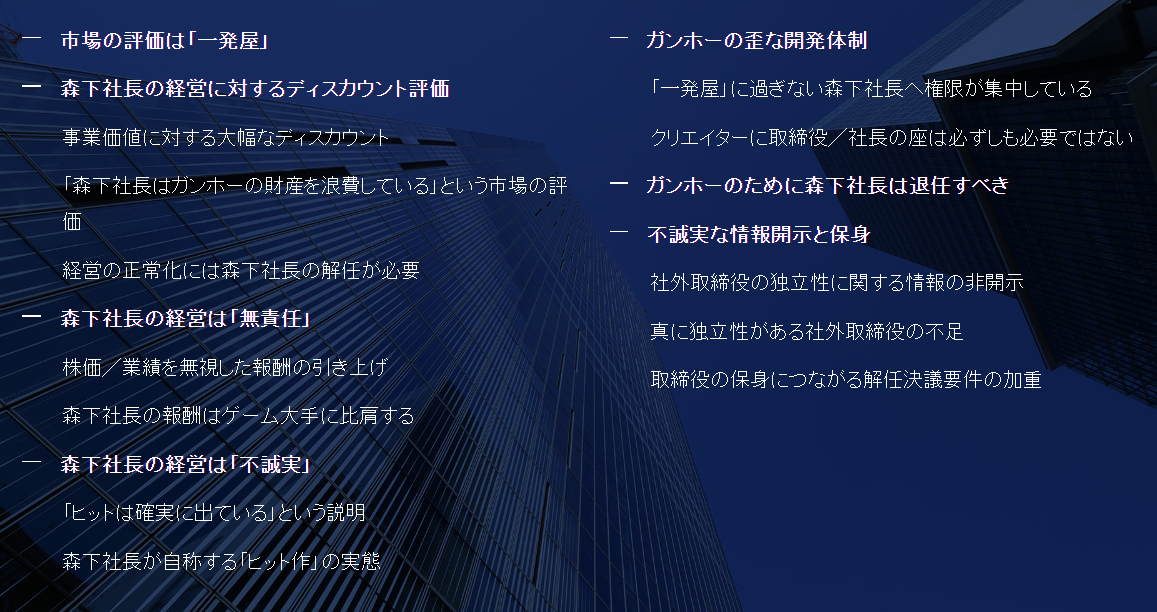 該特設網站上更是「火力全開」,出現多個針對森下社長的辛辣標語,這些用詞直白又強烈,在日本遊戲產業中幾乎是頭一遭,批評如下:
