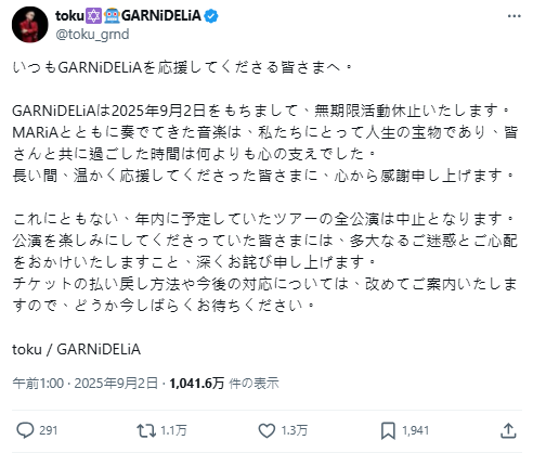 事情經過是,今日早上 toku 突然在個人 X 上發文,表示團體將會即日起無限期停止活動,包含原訂將於今年 10 月來台舉行巡演「GARNiDELiA stellacage tour 2025 [PROGRESS]」,後續千葉、大阪、愛知以及東京的場次將全數取消。