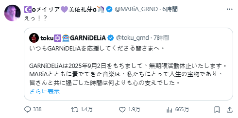 由 MARiA 與 toku 組成的日本雙人創作團體 GARNiDELiA,今日 ( 9/2 ) 突然在由 toku 在社群上宣布將無限期暫停活動,令許多歌迷感到錯愕,而原定的巡迴演出也將全數取消,令不少粉絲感到錯愕,也爆出內部的矛盾問題。