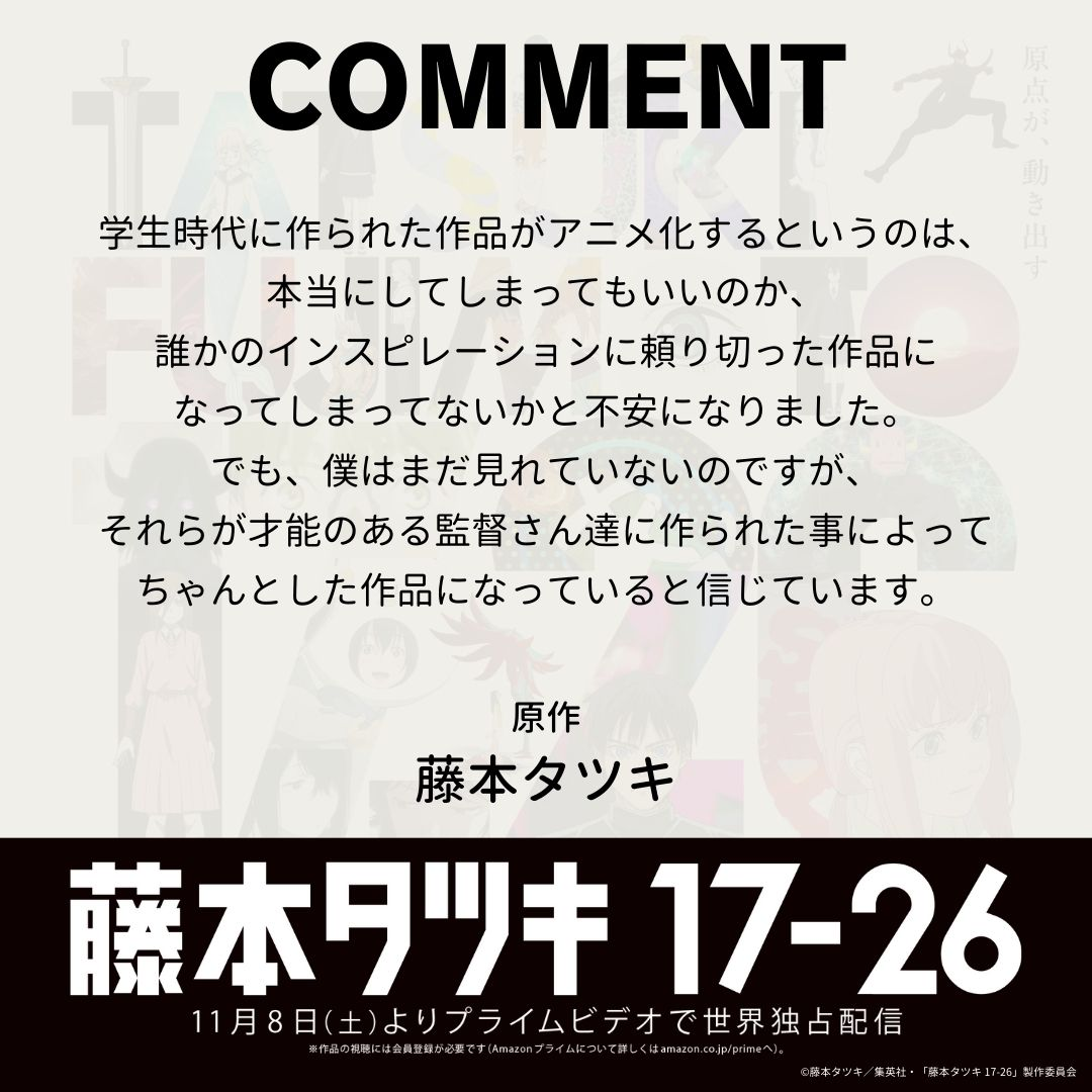 對於學生時期的作品能被改編動畫,藤本樹表示:「老實說一開始很不安,怕這些作品太青澀,甚至只是模仿而已。但交到這麼多有才華的導演手中,我相信它們會變成真正的好作品。」