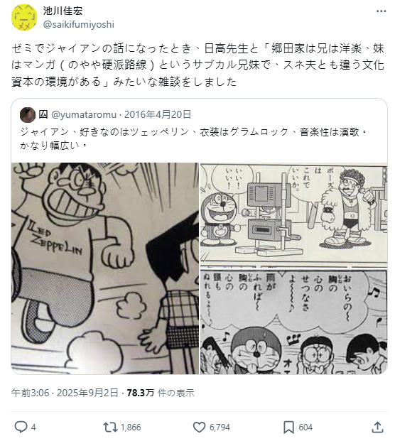 引起討論的推主轉推一則 2016 年的 Po 文,當時的網友用漫畫中的插圖,胖虎的衣服是「Led Zeppelin 齊柏林飛船」的衣服,打扮走華麗搖滾風,但音樂性又偏演歌,範圍超廣的啦。