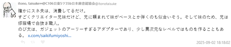 從這次日本網友的討論來看,胖虎或許真的不只是「唱歌會嚇跑人」的搞笑角色,而是被重新解讀為一個兼具洋樂、演歌、搖滾元素的「次文化象徵」。而與妹妹小珠又是一個漫畫家志向的設定,這樣的「創作型兄妹」真的給人不同的觀點來看待。