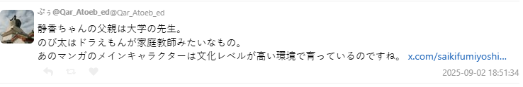 討論同時延伸到其他角色,有人指出,小夫雖然炫耀財富,但更多是「消費文化」,環境也優渥 。靜香的父親則是大學教授,大雄則擁有「哆啦A夢」這個家庭教師般的存在。許多網友認為,《哆啦A夢》的主要角色,其實都生長在相對「文化層次高」的環境中。