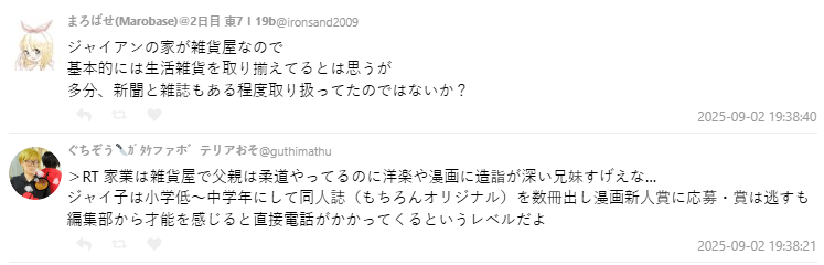 值得玩味的是,剛田家在作品中是經營雜貨店。不少網友驚訝於,這樣一個看似普通家庭,卻能養出對洋樂與漫畫皆有深厚涉獵的兄妹,擁有極高的次文化涵養。
