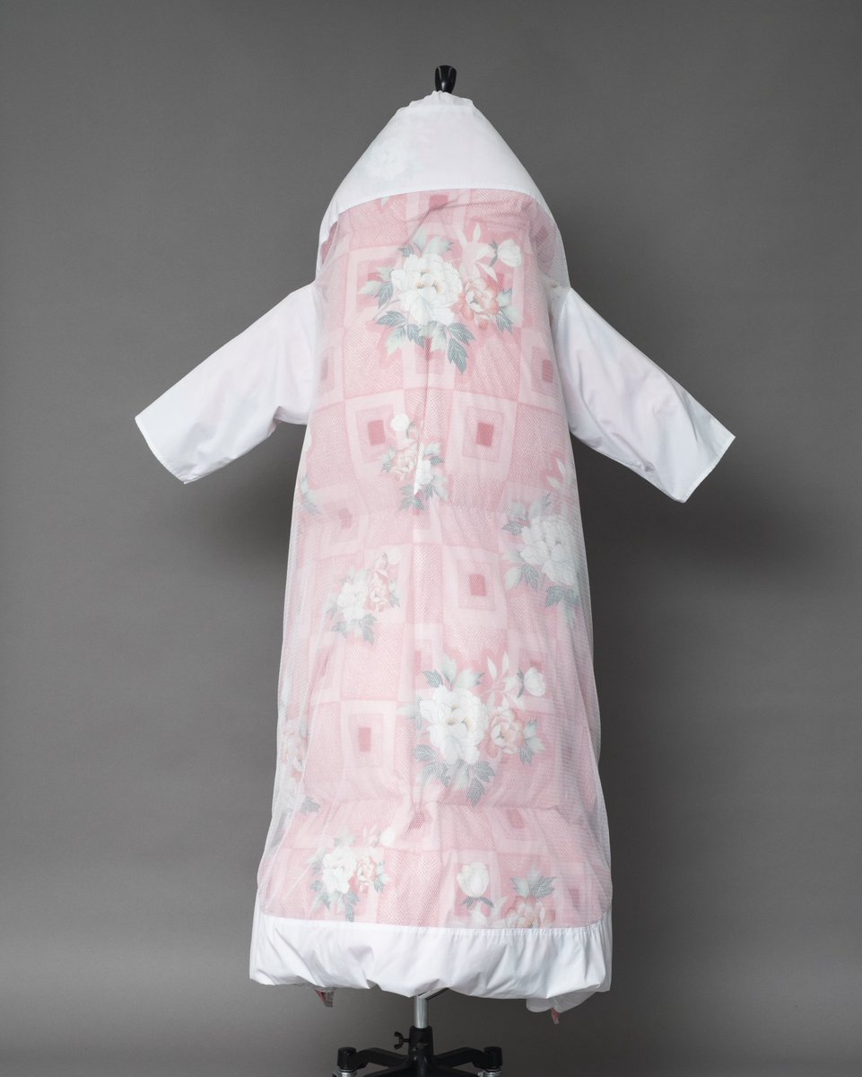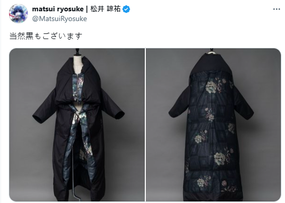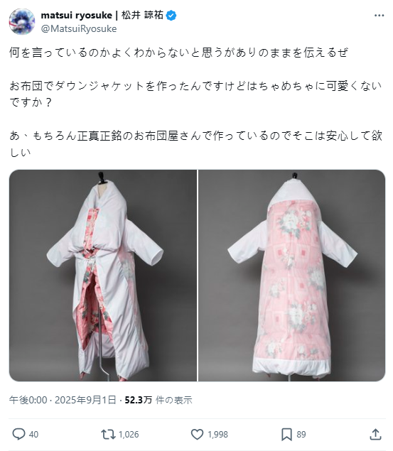 這款外套是由設計師松井諒祐發想,他分享時寫下:「雖然聽起來很難相信,但我真的用棉被做了一件羽絨外套,超可愛吧?而且這是跟真正的棉被店合作的,大家不用擔心品質。」