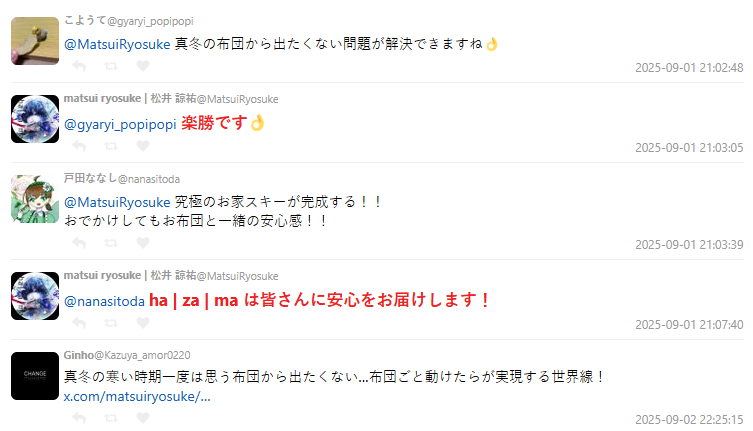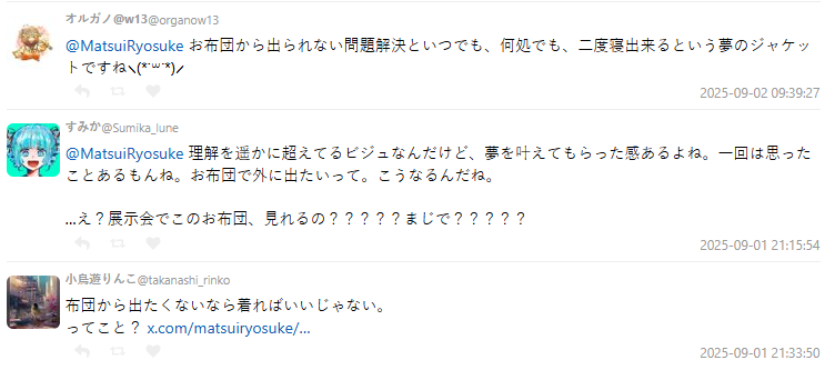 設計師松井諒祐也表示目前這款「棉被羽絨外套」,仍在量產與售價評估階段,但已經成功抓住大眾目光。從實用到時尚話題一次滿足,「出門也能繼續賴在棉被裡」或許真的可以成真 XD。