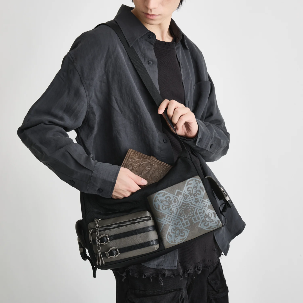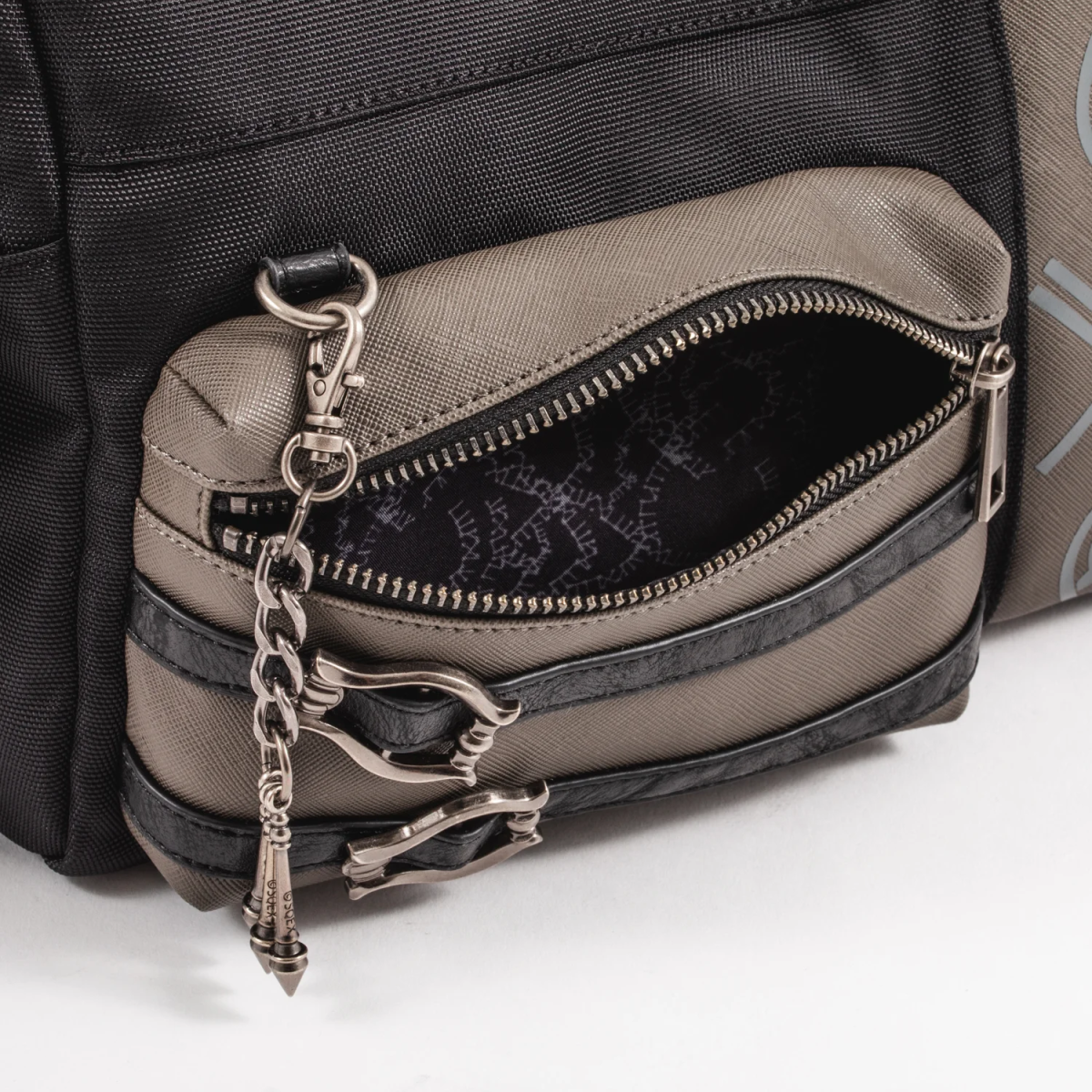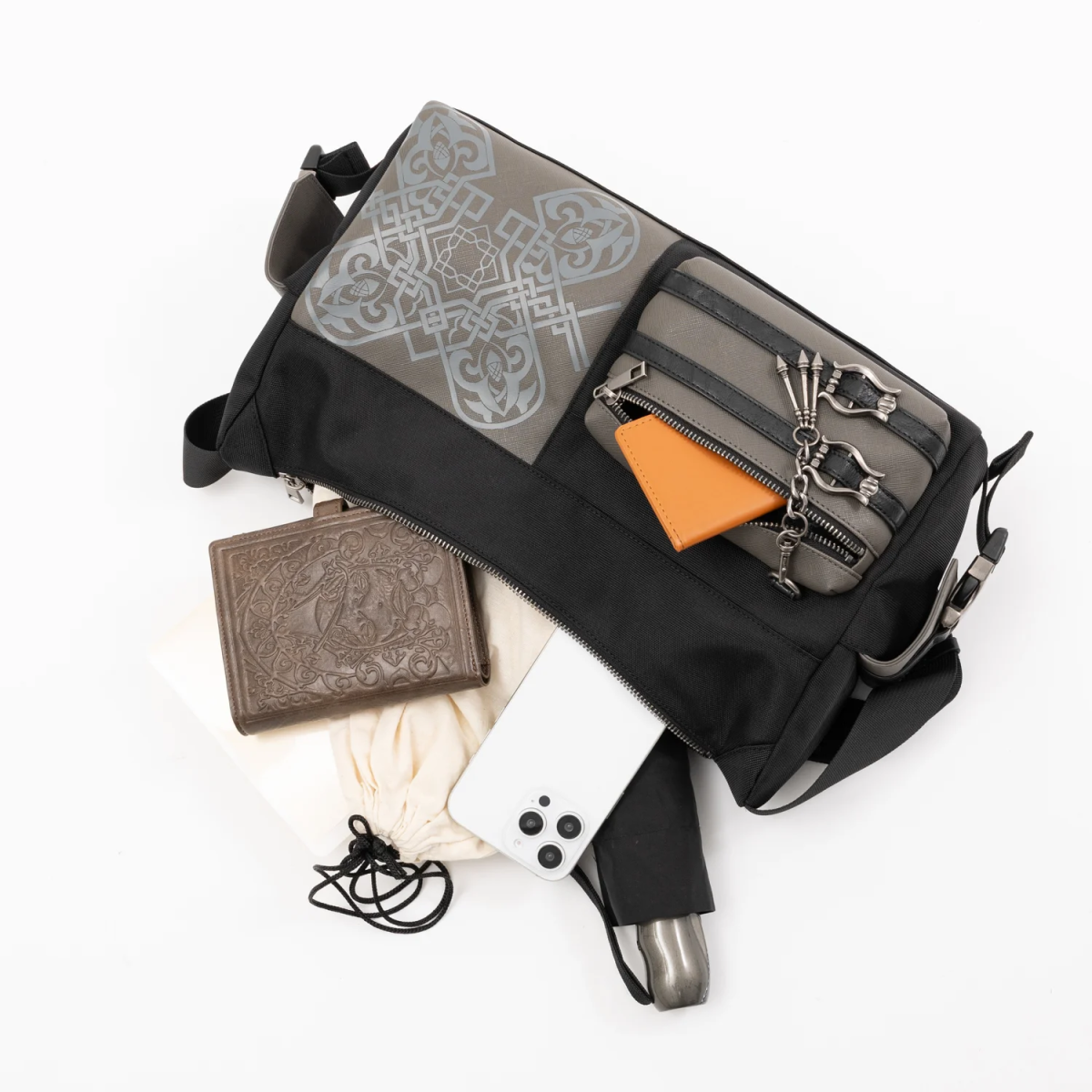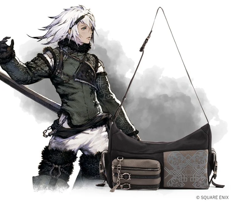 包包正面大膽地融入了尼爾服裝上的紋樣,再加上銀色吊飾跟腰帶裝飾,把尼爾的特色完整呈現在整個包款上。