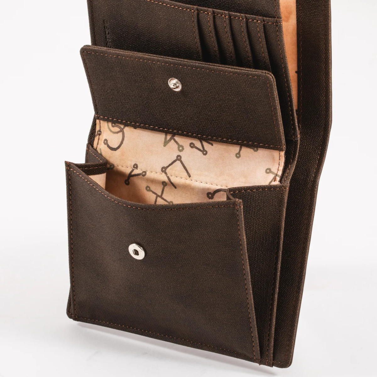 以皮革用壓紋方式重現書本外殼的細節,可以像書一樣打開跟闔上。裡面設計也很實用,有五個卡片夾、零錢袋,還有紙鈔收納區。額外附上的小口袋,不只可以「被封印的話語」,就連日常用的發票也能輕鬆放進去,內裡布料則印滿了天使文字。
