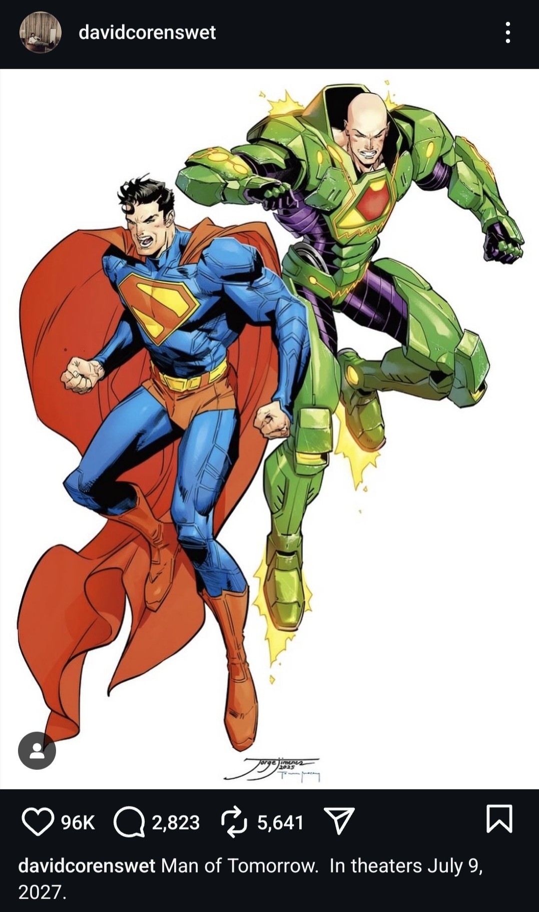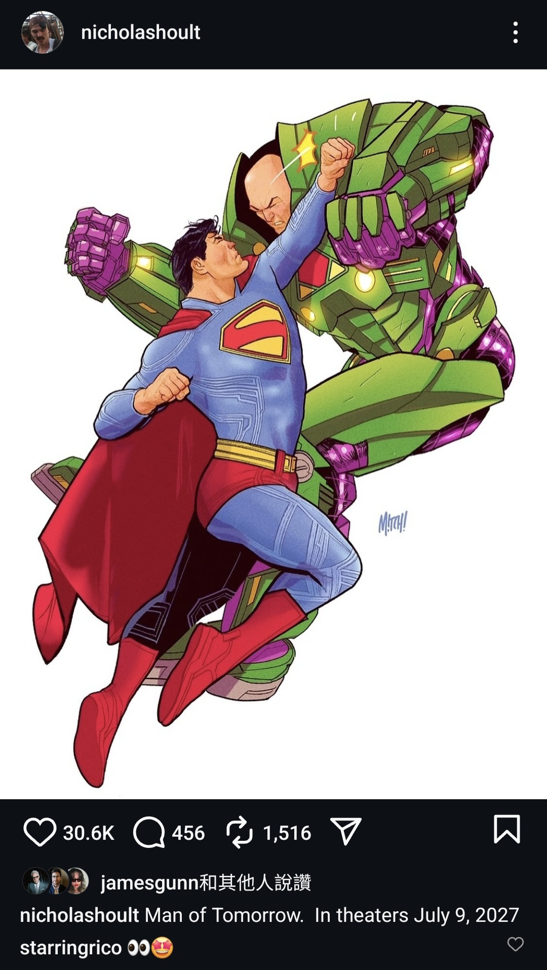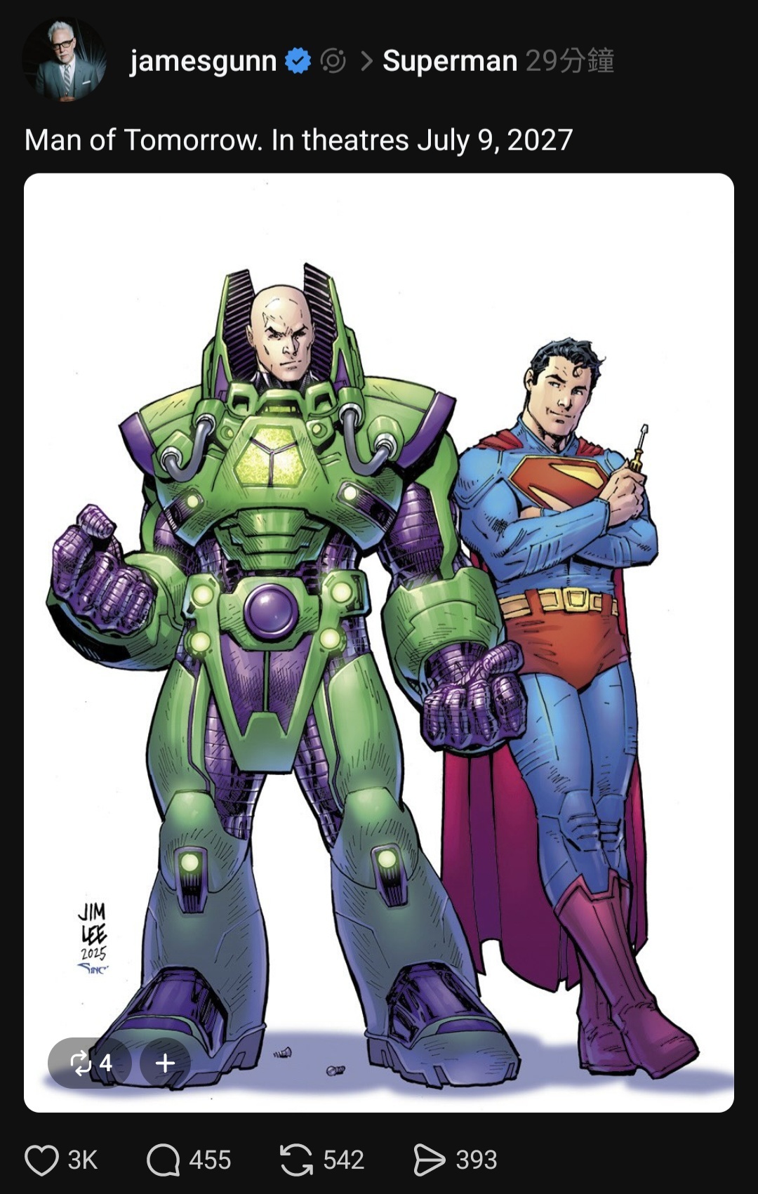 此外,這次的官宣還包含兩項重大要點,其一是片名,續集確定就叫做《Man of Tomorrow》。其二則是,續集確定會讓路瑟穿上漫畫中著名的動力裝甲。岡恩、霍特、寇倫史威等人今天發文所附的圖,都特地選擇了超人有和身穿裝甲的路瑟同框的插畫,暗示已經非常明顯。而除了他們三個,飾演「鷹女孩」的伊莎貝拉莫賽(Isabela Merced)也確定回鍋演出。