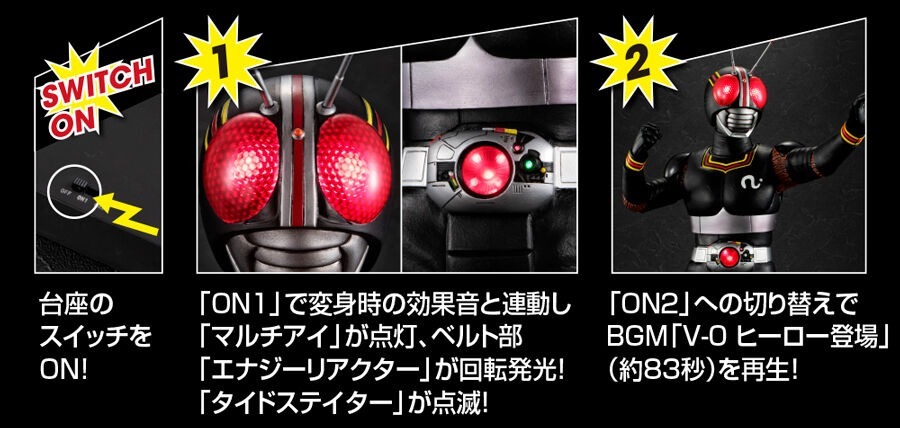 而本作最大的看點是搭載有 UA 系列標誌性的燈光與音效設計,能夠配合呈現視、聽覺上的雙重享受!透過開啟底座的開關 ON1 可以播放變身時的音效並啟動複眼與帝王石腰帶的發光效果,腰帶的核心會隨著音效旋轉發光,再現經典的變身瞬間!切換至 ON2 模式則會播放《假面騎士Black》熟悉的戰鬥 BGM 〈V-0 ヒーロー登場〉,帶來具有臨場感的多層次感受!
