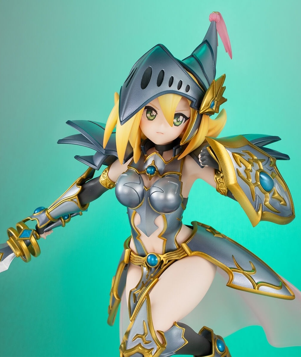 本次的 ART WORKS MONSTERS 龍騎士黑魔導女孩高約 22 公分,細緻的還原黑魔導女孩本體造型,製作了她手持劍盾的躍動姿態。裝甲的細節與彩色分層處理展現了極高的質感,臀部延伸的粉色襯裙使用彩透材質打造出輕盈的視覺效果,白皙的大腿與隱藏在盔甲下的肌膚看起來吹彈可破,劍、盾及鎧甲上的雕花造型也都被細膩的再現,可以配合專用台座與支架穩固的展示!雖然沒有傳說之龍迪馬歐斯,但重點都已經收錄在其中了對吧!