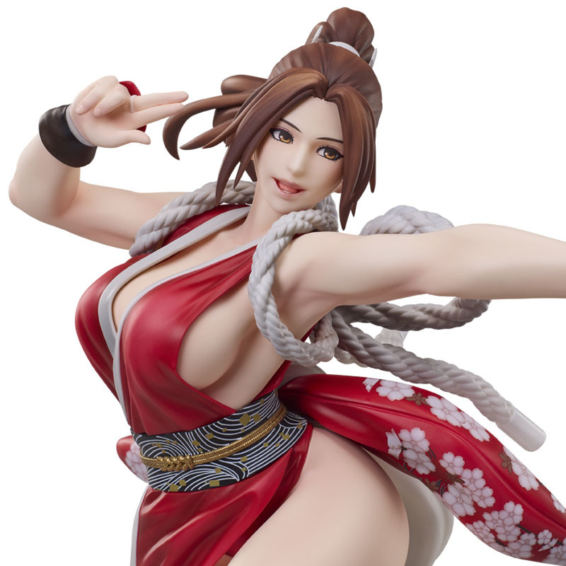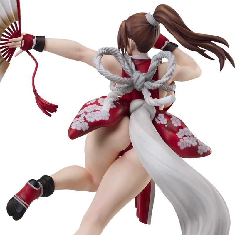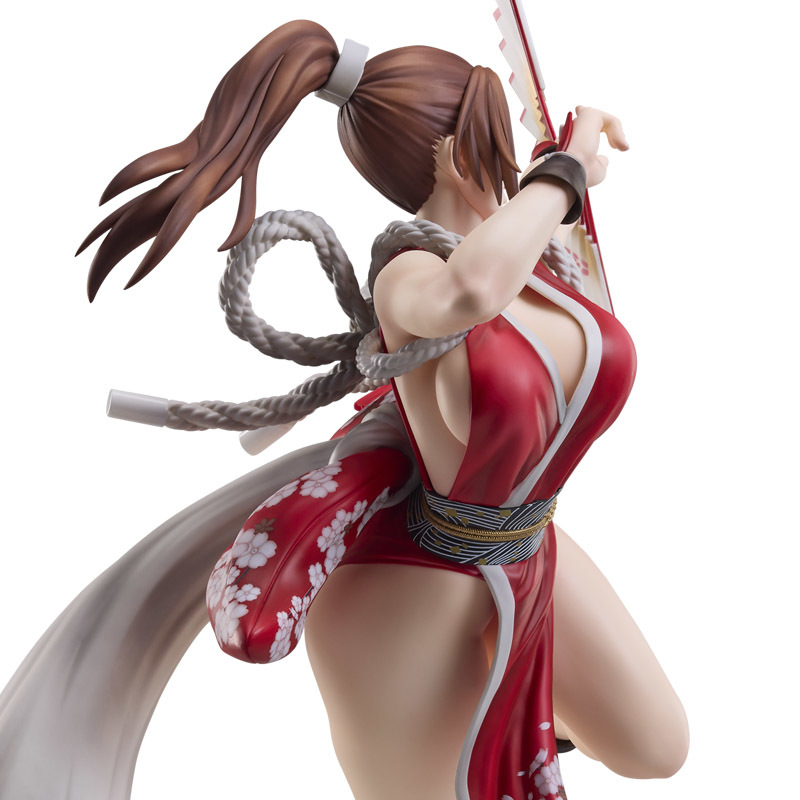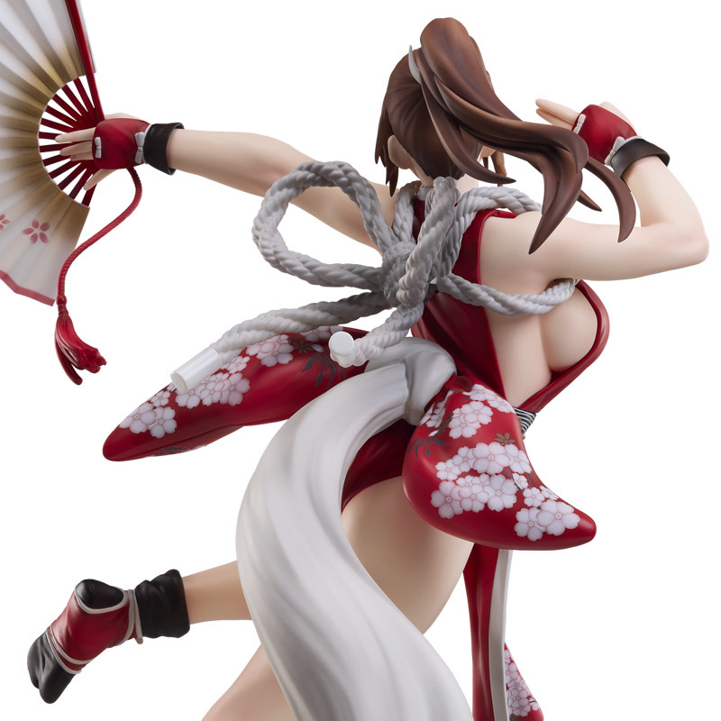本次立體化的不知火舞是依照 2025 年新作《餓狼傳說 群狼之城》當中的最上級超必殺技(ヒドゥンギア):櫻嵐之舞、朱雀為題打造,以 40 公分大魄力尺寸再現不知火舞發招瞬間優美又火辣的姿態。從右手的手勢、伸出扇子的左臂、發動招式時會換上的經典浴衣,到婀娜多姿的姣好曲線都充分還原,除了將服裝上頭的圖案、皺摺仔細還原外,袒露在外的白皙肌膚更利用陰影效果提升整體的立體感,超辣!