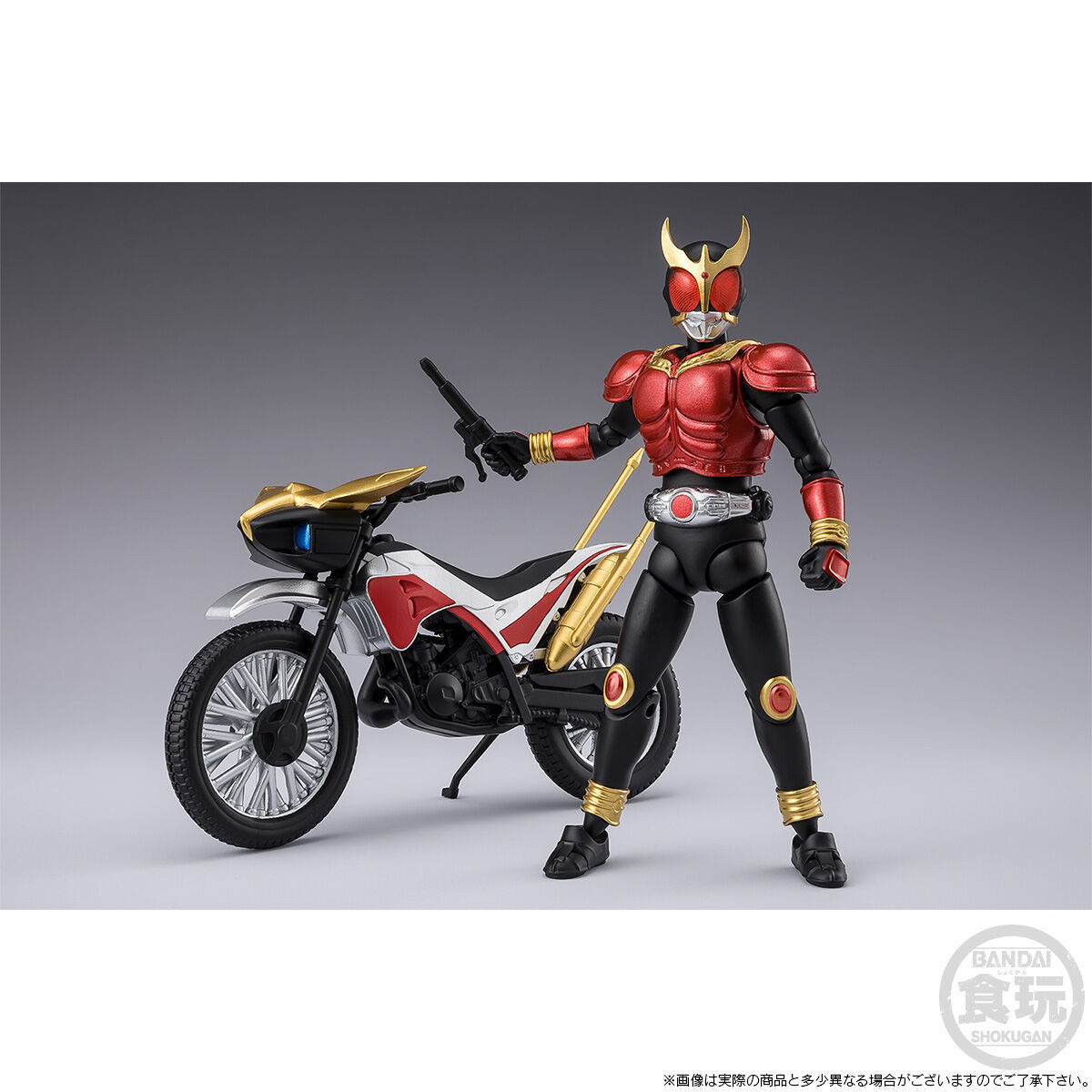 配件附有 6 種替換用手掌零件,全身具備靈活的可動關節設計,能夠擺出戰鬥架式、必殺技「全能踢」等躍動姿勢。而機車「追跡者2000」則採用完全新規造型,擁有全長約 10 公分尺寸與多種金屬色塗裝,並重現內部機械結構的細節造型,搭配空我本體就能擺設出帥氣騎乘姿態。此外也附上將右側手把拆下後的警棍零件。