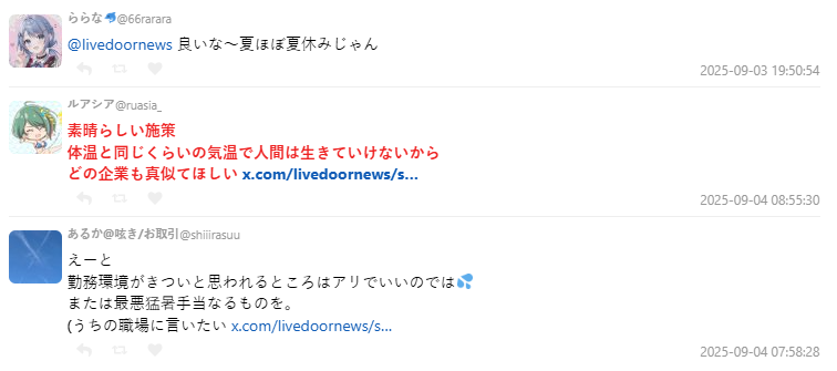 新聞曝光後,X 上也掀起廣大迴響,有網友稱讚這才是新時代的企業文化,「如果自己都不快樂,就不可能帶給消費者幸福。」也有人羨慕表示:「這種天氣還要再嚴苛環境工作的人真的是福音!」、「想跟自家公司也建議一下。」