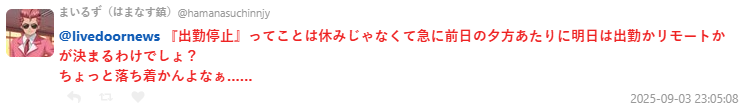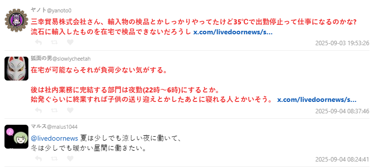 但也有員工角度的疑慮:「所謂『出勤停止』,是不是前一天晚上才突然決定明天放假還是遠端?這樣其實不太安心。」另有人指出實務困難:「檢品工作要怎麼在家做?總不能遠端檢查進口貨吧?」,也有人提出「夏天晚上工作、冬天白天上班」的彈性排班方式。