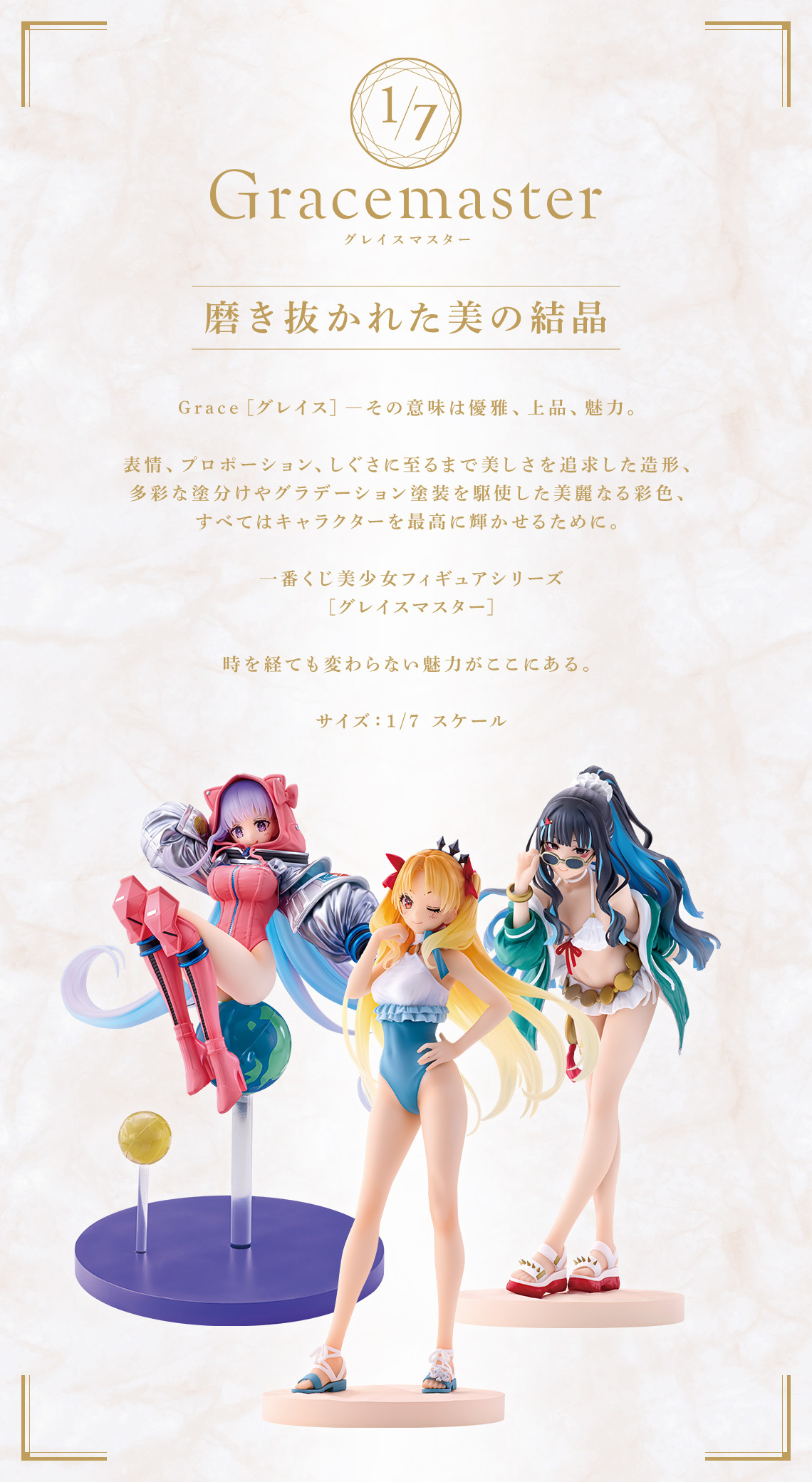搶先公開的「一番賞 Fate/Grand Order ~名流夏日體驗 & 新靈長後繼戰~」,以 2024 年的限定泳裝活動《BB呈獻☆名流盛夏體驗! ~反擊的杜拜~》與泳裝活動後半期間限定主線《奏章Ⅲ 新靈長後繼戰 Archetype.Inception》為主軸,公開了活動造型的 A 賞Beast/艾蕾什基伽爾、B賞Moon Cancer/BB Cosmo、C賞Moon Cancer/特諾奇蒂特蘭角色模型,採用主打優雅魅力的 1/7比例 Gracemaster系列,細膩呈現細節與精緻美麗的色彩!另外還有新系列的Moon Cancer/岸波白野(男/女)絨毛玩偶GENIC(暫譯,ぬいジェニック),更多豐富的獎品,將於後續公開!