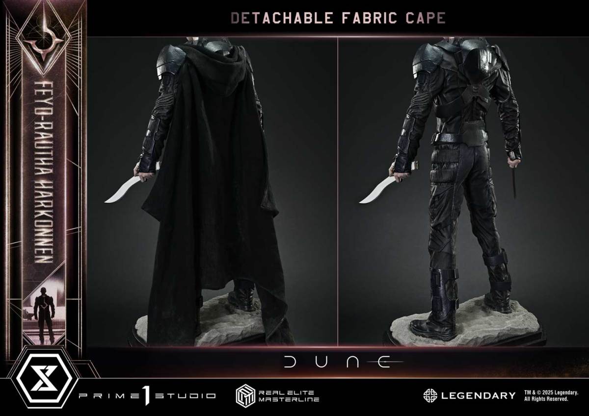 本次的菲得-羅薩·哈肯能 1/3 比例收藏雕像高約 80 公分,為他打造了手持黑白雙刃、在戰前靜謐而壓迫的站姿,完整重現演員奧斯汀·巴特勒(Austin Butler)在片中經過特效化妝的標誌形象,深陷的雙眼、蒼白的膚色與令人不安的冷酷面容都被細膩刻畫再現!服裝部分以複合材質配合舊化塗裝呈現戰鬥服上裝甲的質感與布料編織的紋理細節,布質材質打造的披風有著自然的垂墜感,可以拆卸下來展示僅著用戰衣的造型!腳下的台座結合厄拉科斯的荒漠與哈肯能家族徽章,有著十足的厚重感,能穩固的展示他讓人不寒而慄的暴君的氣場!
