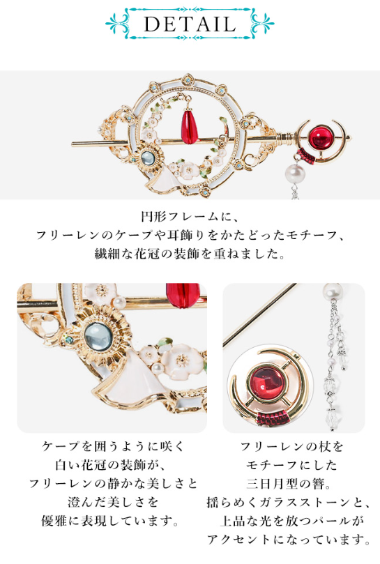可以看到髮飾上本體以兩人代表性的花圈為基礎,中央配上芙莉蓮的耳飾吊墜,中央的簪本體也配上魔法杖的造型呈現。
