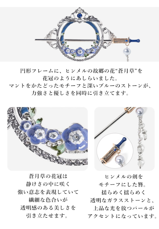可以看到髮飾上本體以蒼月草的花圈為基礎,中央的簪本體也配上欣梅爾的劍的造型呈現。