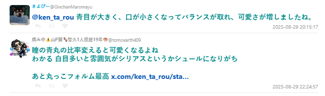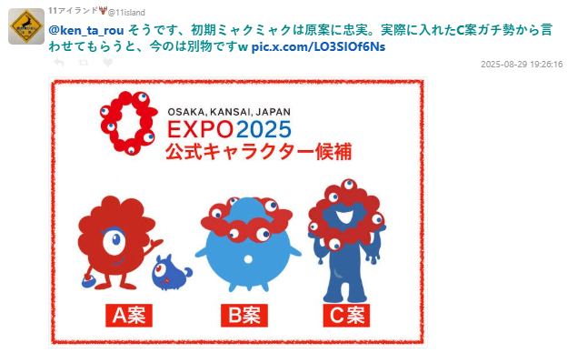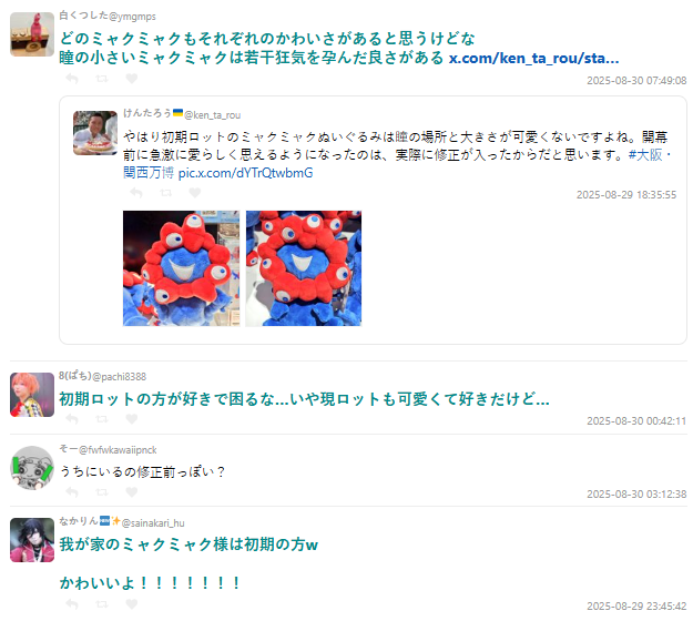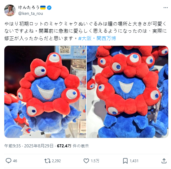 最早引起話題的是推主「けんたろう」,他指出初期批次的娃娃眼睛位置和大小讓人覺得「不太可愛」,但隨著世博臨近,娃娃突然「變萌了」,懷疑是官方做了修正。
