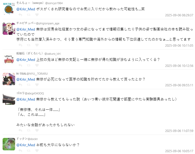 不少人腦補更多,認為無慘這些年說不定除了找紫藤花外還進修醫學知識,在各地機關潛伏跟上科學知識,傳遞給這些旗下的上弦下弦鬼部下們。