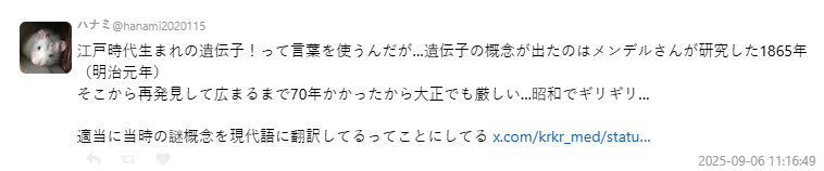 另一位網友則提到「遺傳子」的概念出現在 1865 年,但普及要等到昭和才算真正流行,所以用語上多少還是有翻譯潤飾成分。