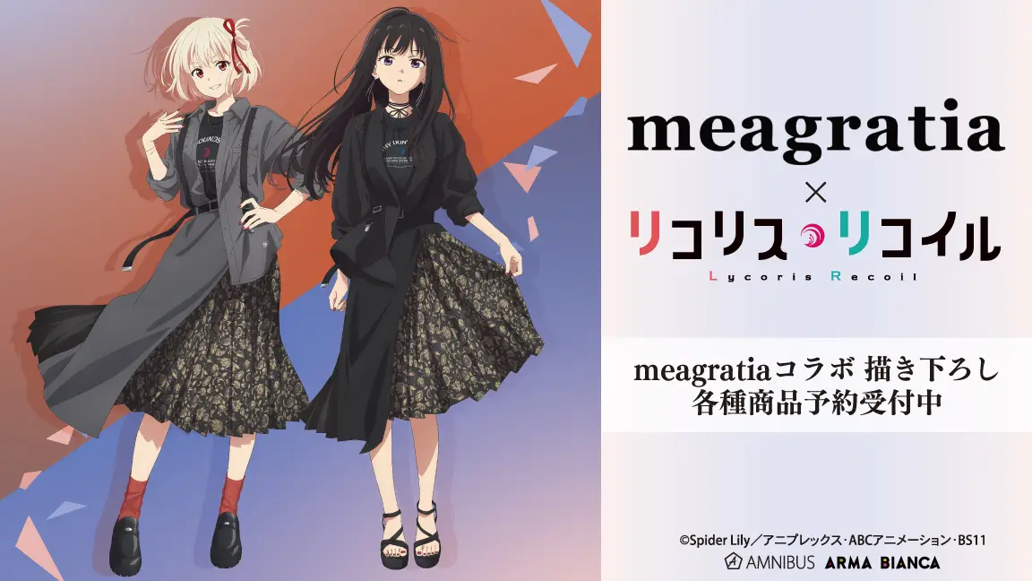 近日宣布與日本服飾品牌 meagratia 合作,特別以千束與瀧奈著用的概念設計一系列服飾並釋出視覺圖,現已於 AMNIBUS 官網 開放預購,部分商品並附有特典。