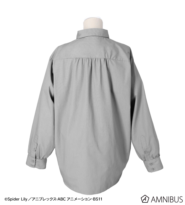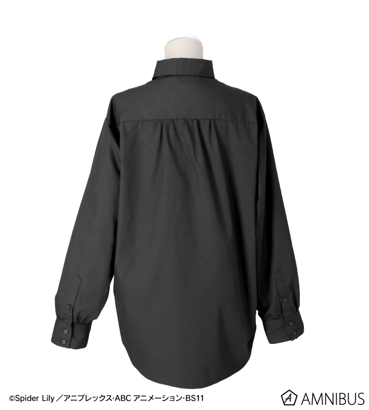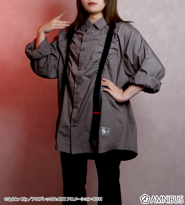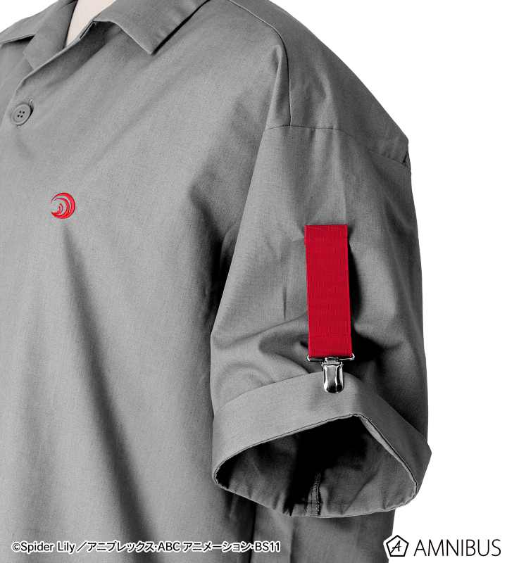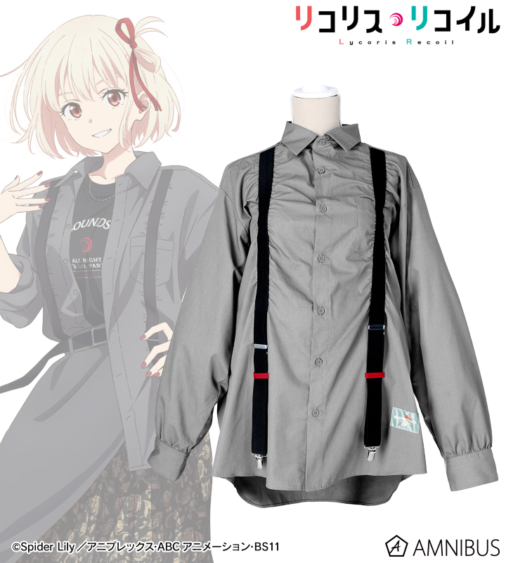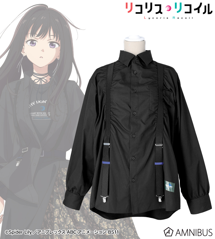 襯衫前身特別加上了吊帶風的裝飾設計,中間還縫了象徵千束配色的調節環作為點綴。左下角更藏有小巧思:紅色彼岸花,搭配「錦木千束」名字和作品標題的原創標籤。吊帶的五金配件是真的能用,不只可以固定褲子,還能改變襯衫的版型,穿搭變化更多元。