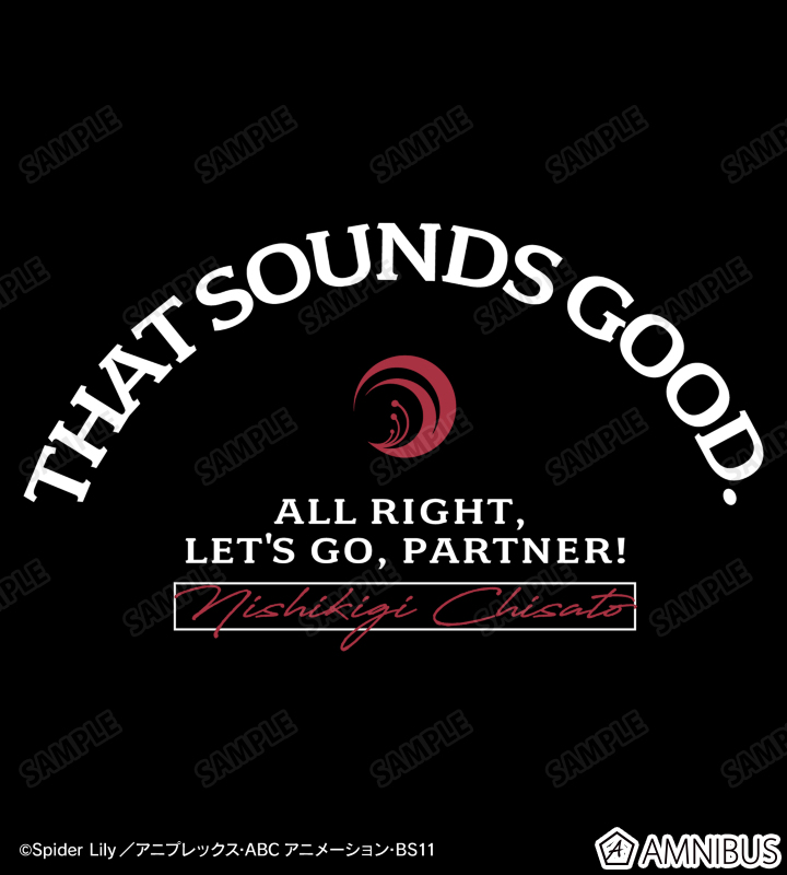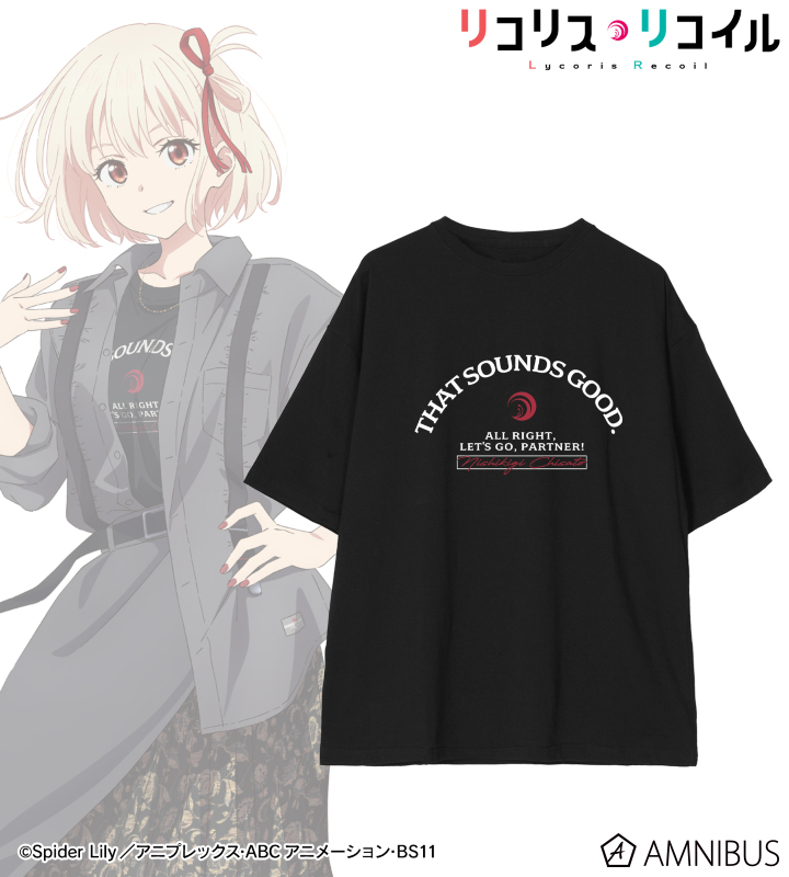 分別推出千束與瀧奈各別款式,兩款衣服上面除了不同顏色的 「Lycoris」圖騰外,分別配上兩人在動畫第 13 話的台詞。分別是「不錯嘛,就這樣吧!走啦,搭檔——!」跟「要不要就從你放棄的事情重新開始呢?」以英文校園字體排版呈現。