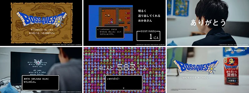BOSS 官方也在東京地鐵新宿站展出了期間限定戶外廣告以及廣告影片,展現企劃團隊對這款遊戲的熱愛與敬意,還親自遊玩《勇者鬥惡龍 III》,把所有能對話的角色一一數出來,結果總共有 583 人(加上隊伍成員 4 人)。