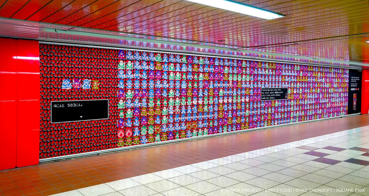 另外,在新宿車站,還有長達 15 公尺的巨幅廣告,寫著「拯救世界的不只有勇者,而是所有辛苦工作的人」,放上所有 583 人出現在《勇者鬥惡龍 III》的角色。