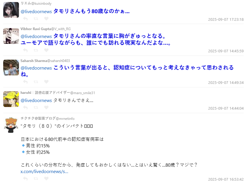 不少粉絲聽聞消息後驚訝地發現,才發現原來塔摩利已經高齡 80 歲,感嘆:「原來他已經 80 歲了啊…」;也有人指出,在日本 80 出頭的失智症比例並不低,男性約 15%、女性則接近 25%,因此即便是明星,出現相關徵兆也不算罕見。