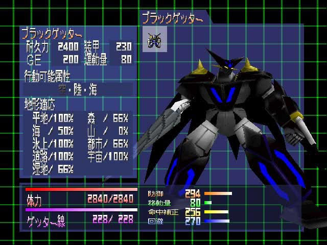 僅在《蓋特機器人大決戰》登場的漆黑蓋特是早乙女研究所遭到昆蟲軍團奇襲時,緊急由玩家扮演的主角駕駛出擊的單人座護衛用蓋特機器人。由於戰況急迫,此機緊急使用了真蓋特1的頭部、蓋特飛龍的身體、蓋特2的右腕、蓋特機器人號的左腕等備用零件拼湊而成。雖無飛天遁地、變形合體的能力,卻擁有匹敵新銳機種的力量,能施展「鑽岩爆擊」、「暗黑亂武」等強力必殺技。