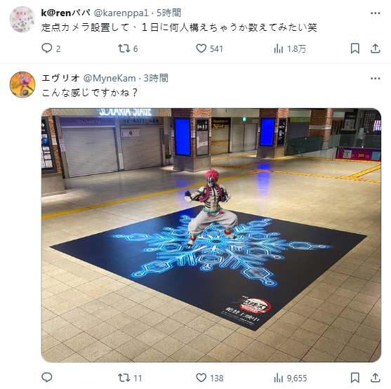 當然這也反映《鬼滅之刃劇場版 無限城篇》的熱潮跟猗窩座的高人氣,僅僅擺放這樣的鋪設就可以引起話題,或許真的可以擺個定點攝影機看看民眾的反映 XD。