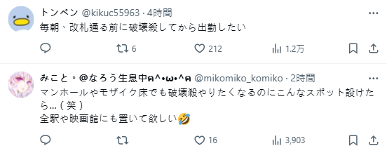 「每天上班前都想來個破壞殺暖身一下」、「拜託架個定點攝影機,數數一天會有多少人擺出戰鬥姿勢」、「我要站在正中間感受一下!」、「想要更多車站都可以擺一個!」。