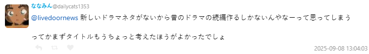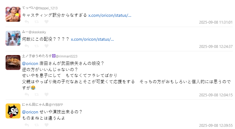 最多質疑集中在演員陣容上。有人質疑:「唐田英里佳演女主,搞笑藝人せいや演男主?這組合真的太謎了吧。」還有人開玩笑說:「乾脆讓せいや演男主角的兒子,整天被打槍,然後武田鐵矢在旁邊說『果然是我的兒子』,這樣反而更有趣。」