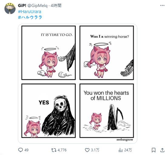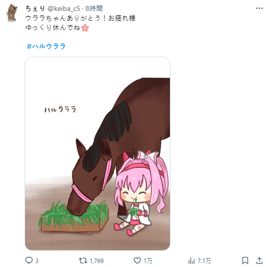 這件事情不只讓日本馬迷們感到難過,更多的是海外粉絲,因為當時很多人因為知道春烏菈菈的事蹟後被感動,才掀起今年七月一波捐牧草給春烏菈菈的集體活動。