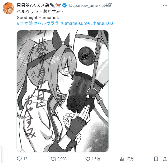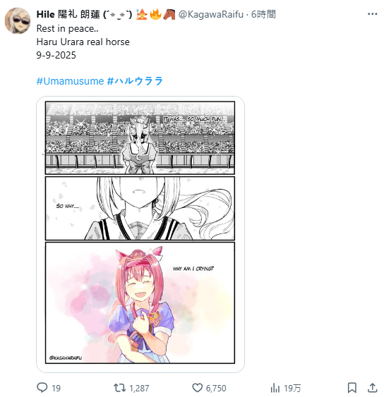 不過被海外玩家給予厚愛的「春烏菈菈」原型馬,在昨日 ( 9/9 ) 確定牠在凌晨,在工作人員的陪伴下在牧場安靜離世,也吸引了日本與海外相當多網友粉絲獻上祝福。
