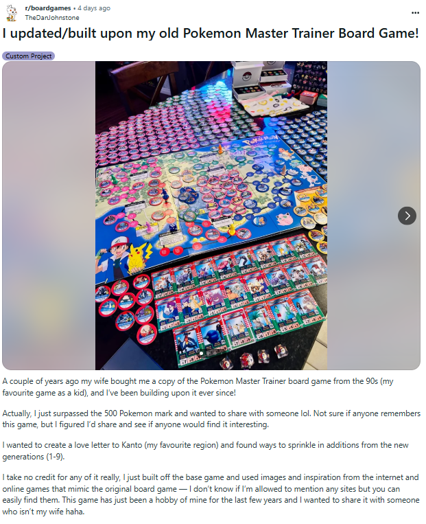 這個分享也激起不少海外網友的回憶,畢竟這款桌遊過去也不少人曾經玩過,現在看到除了回憶殺外,許多人也讚賞發文的 TheDanJohnstone 居然改造這款桌遊讓他可以更貼近現在的寶可夢環境,創意讓人欽佩。