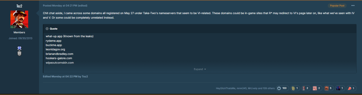 據玩家 Tez2 在 GTA 論壇分享,他發現數個域名均於 5 月 27 日註冊,並掛在 Take-Two 自有伺服器之下。這些域名包括 what-up.app、rydeme.app、buckme.app、leonidagov.org、brianandbradley.com、hookers-galore.com 等,名稱相當獵奇。雖然目前尚未能訪問任何實際內容,但這些發現讓玩家聯想到 Rockstar Games 一貫擅長的惡搞風格。