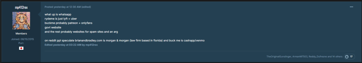 玩家 Mp412rex 猜測,What Up 可能是 WhatsApp 的戲仿版,RydeMe 或許對應 Uber/Lyft 類型的叫車服務,BuckMe 則可能是仿造 Patreon 的募資平台,而 Leonidagov.org 可能是假政府網站。其餘幾個名稱則仍是謎團,不過有些看起來似乎已經透露相當直白的暗示。